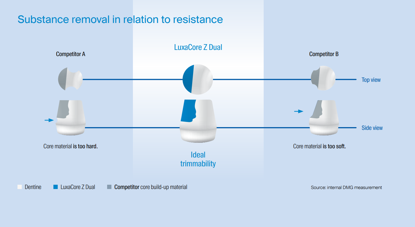 Groeven en trappen in de core build-up behoren tot de verleden tijd, aangezien LuxaCore Z Dual kan worden bewerkt en aangepast als dentine.